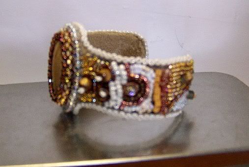 This is the beginning of a cuff using an amethyst stone that my friend Ralph made for me. I am in love with the Swarovski sequins and will definitely need to find a supplier that will sell them in bulk.